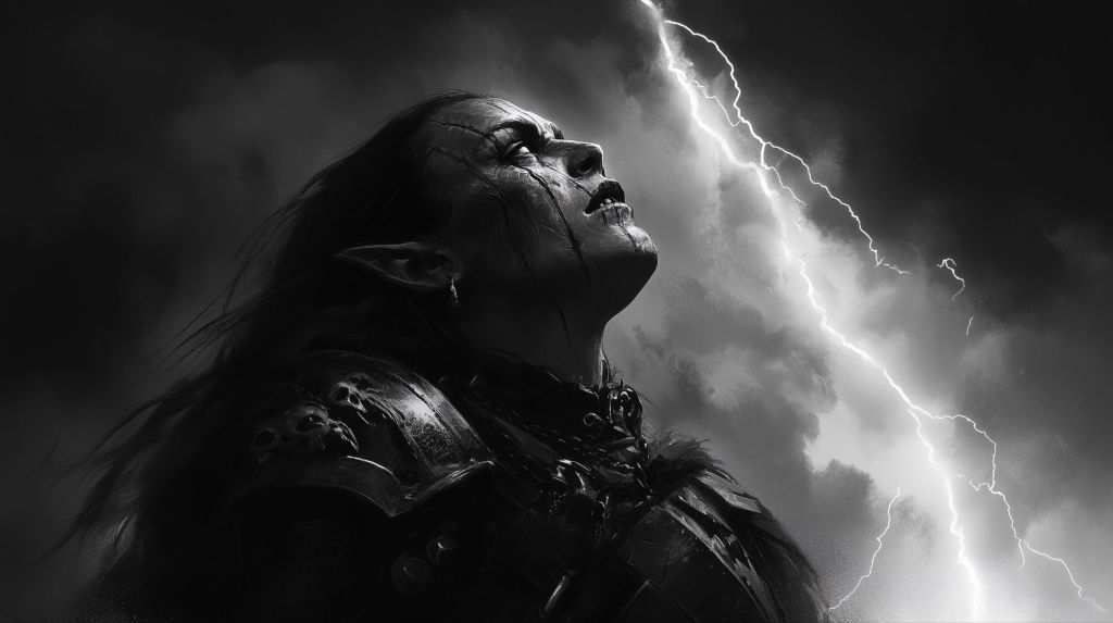 Bruxa Ironskull raised her face to the darkening sky, inhaling deeply as the first electric tang of approaching lightning scorched the air. Around her, the rest of the adventuring party scurried to secure the campsite—the human wizard Alastair muttering protection incantations, the elven twins Lyra and Lysander hastily erecting a reinforced tent, and the halfling rogue Pip frantically gathering their supplies before the deluge hit.