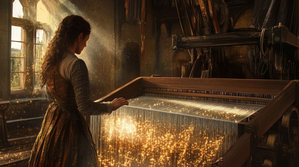 “Enter,” she called, not taking her eyes from the half-completed tapestry where cities rose and fell in metallic thread, where rivers of silver meandered through forests woven with strands dyed in colors that changed depending on how the light struck them.