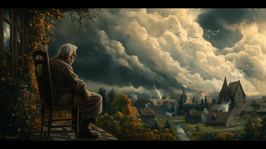 The morning ache in my knee heralded rain long before the dark clouds gathered over Arkadale. Some folk still called it my “arrow-knee,” though thirty years had passed since that Blackmoor bandit’s lucky shot ended my adventuring days. I eased myself onto the worn bench outside my cottage, the wood smooth from years of this same ritual, and watched the town awaken beneath a sky heavy with promise.