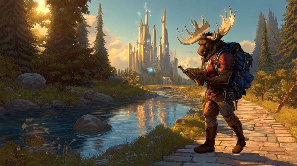 The Luminescent River caught fragments of late afternoon sunlight, transforming them into dancing coins of gold that shimmered beneath its surface. Albrix followed the silver canals northward as Mira had instructed, his hooves creating a gentle rhythm against the pristine walkways. The journal bounced softly in his grip, already eager for new entries, while the crystal spires continued their eternal song—a harmony that seemed to weave itself into the very fabric of his thoughts.