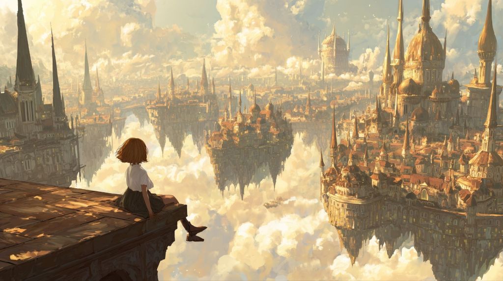 Kira Cloudweaver dangled her bare feet over the edge of the floating garden terrace, watching the amber morning sky swirl with patterns that reminded her of the honey cakes her grandmother made on wind-blessed days. Three hundred feet below, the lower districts of Nimbustown continued their slow rotation around the island’s crystalline core, but up here in the residential quarter, everything felt deliciously still.
