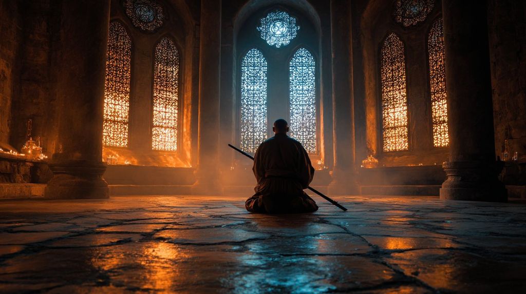 Spirituality was not separate from his warrior’s path; it *was* the path, as essential as breath and as constant as the heartbeat that thundered in his chest during combat. Every morning meditation prepared him not just for the day’s trials but for the moment when steel would meet flesh and he would become an instrument of divine will made manifest in the material realm.