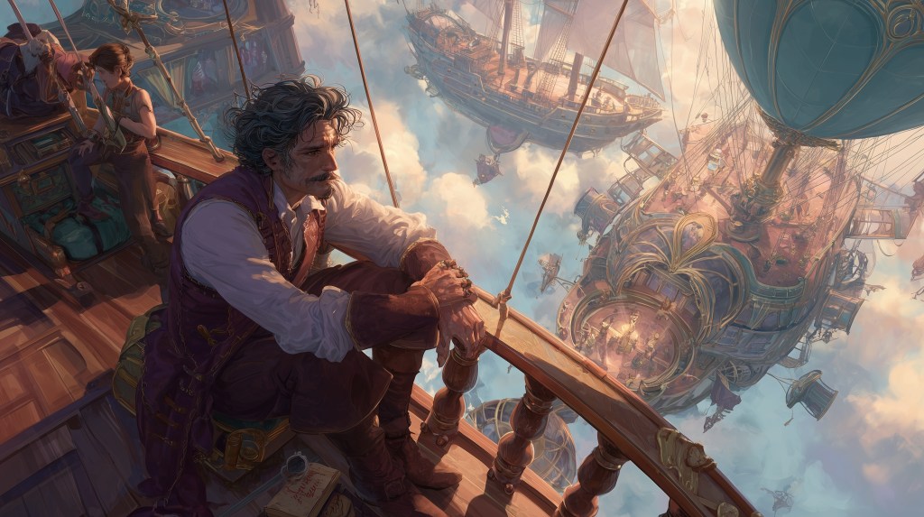 The wind-ship “Fortune’s Edge”cut through the amber clouds above the Borderland Reaches like a blade through silk, her enchanted hull gleaming with protective wards that cost more gold than most merchants saw in a lifetime. I stood at the prow, one hand resting on the crystalline navigation orb that pulsed with captured starlight, watching the unmarked territories spread beneath us like a map of endless possibility.