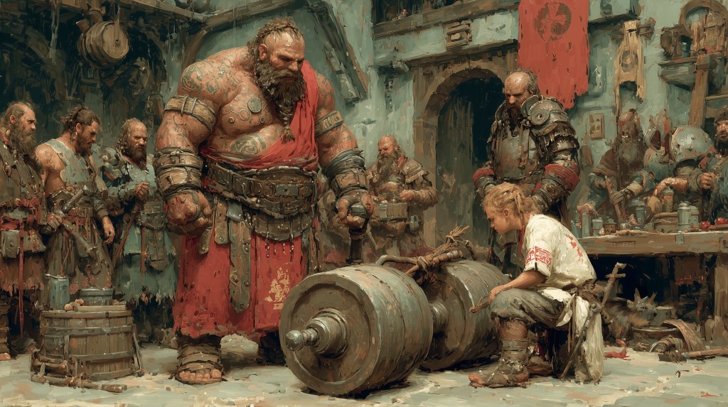 The iron weights arranged along the platform’s edge had been forged from ore mined during the mountain’s passage through the Ferrous Valleys three generations past, their surfaces worn smooth by decades of hands gripping, lifting, returning them to their resting places with the reverence others might reserve for religious artifacts. Each piece bore the weight-marks etched by the smiths who had cast them—fifty pounds, seventy-five, one hundred, progressively heavier until they reached the massive two-hundred-pound stones that only the most accomplished warriors could lift overhead.
