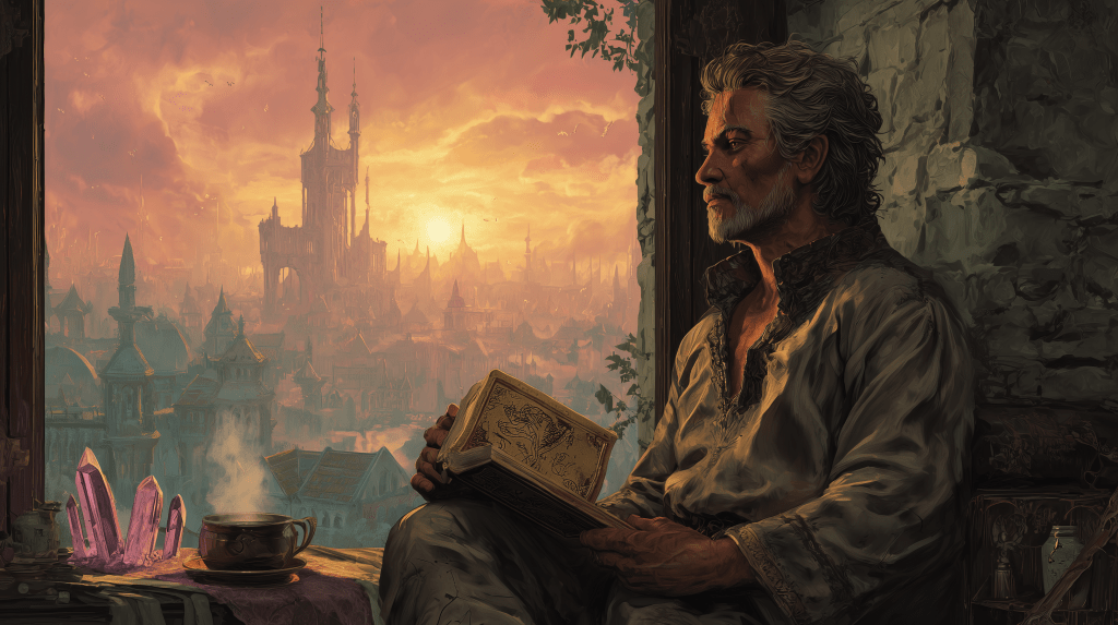 When the fourth passage was complete, he closed the book with reverence and returned it to its silk wrapping. The tea was finished, the cup empty. Outside, the sun had breached the horizon, painting the Crystal Spires in shades of amber and rose gold.